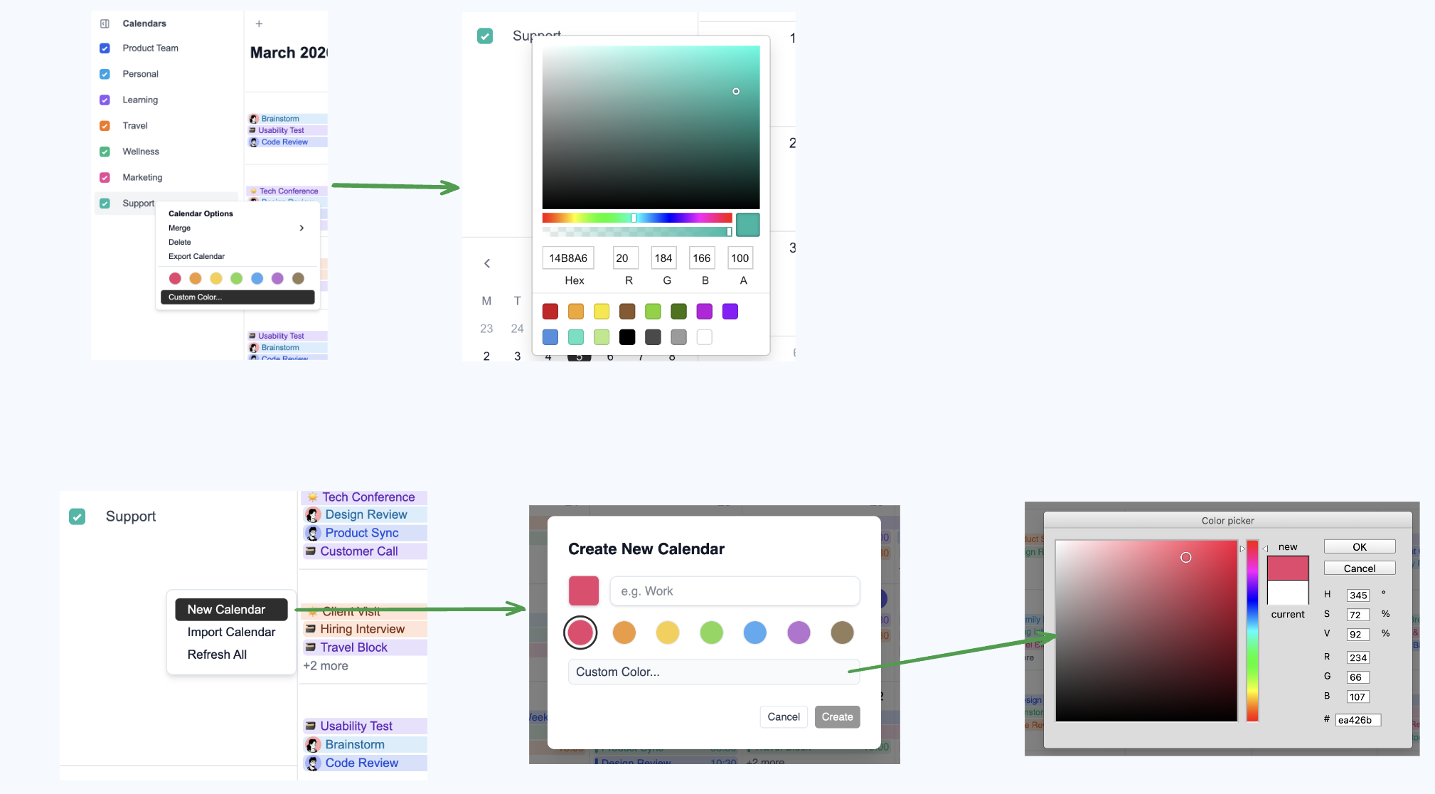 sidebarCalendarColorPicker | A color picker used for calendar colors in the sidebar. | { color, onChange, onChangeComplete } |